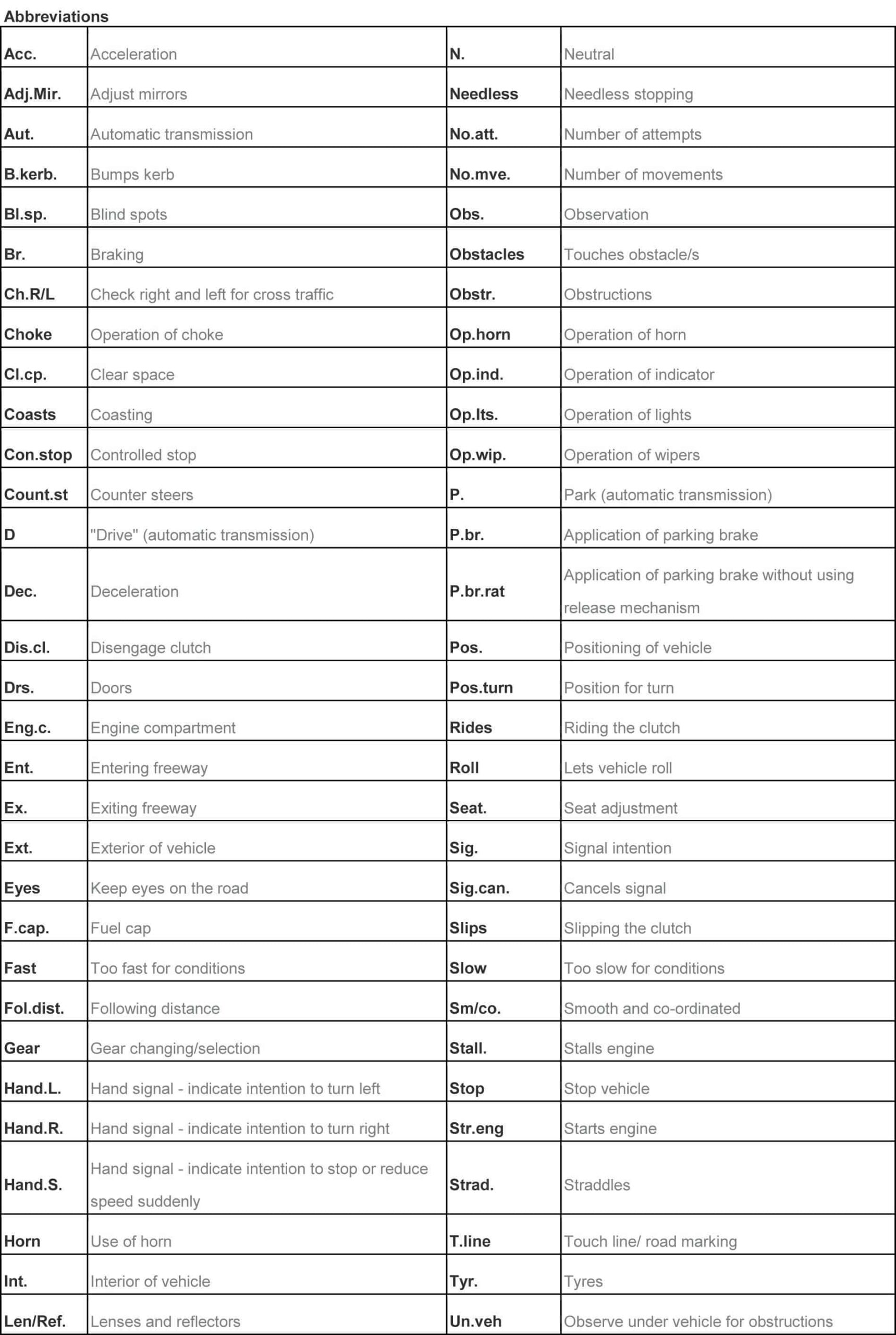 By familiarizing yourself with the abbreviations on the driving test score sheet, you can better understand what the examiner is looking for during your test. Use this knowledge to focus on improving your weak areas and showcase your strengths on test day. Good luck!