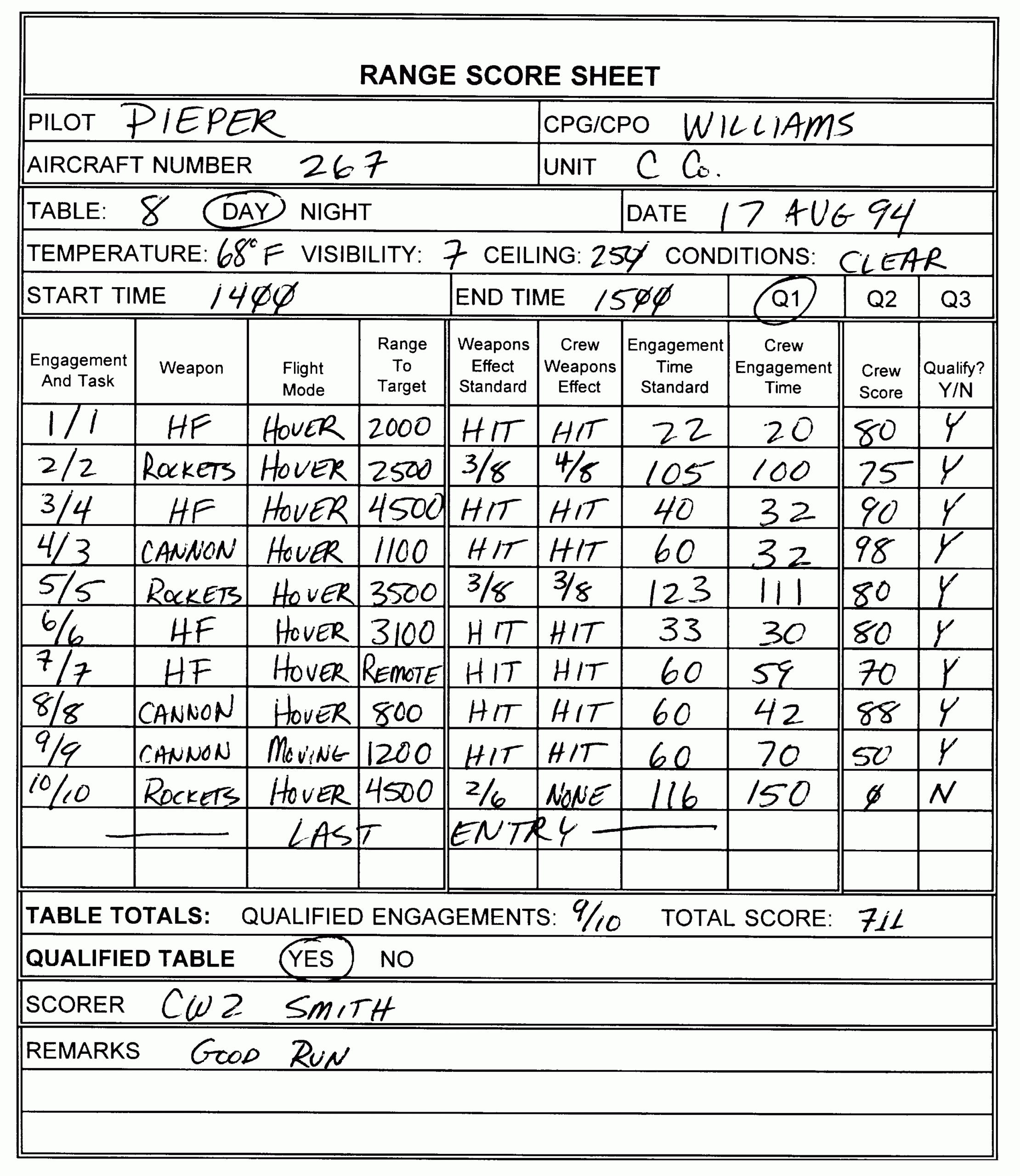 Gunnery Skills Test Score Sheet