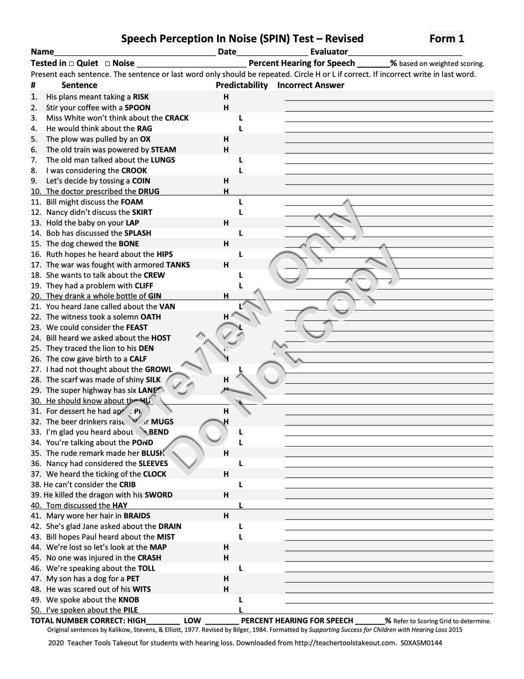 Hearing In Noise Test Score Sheet