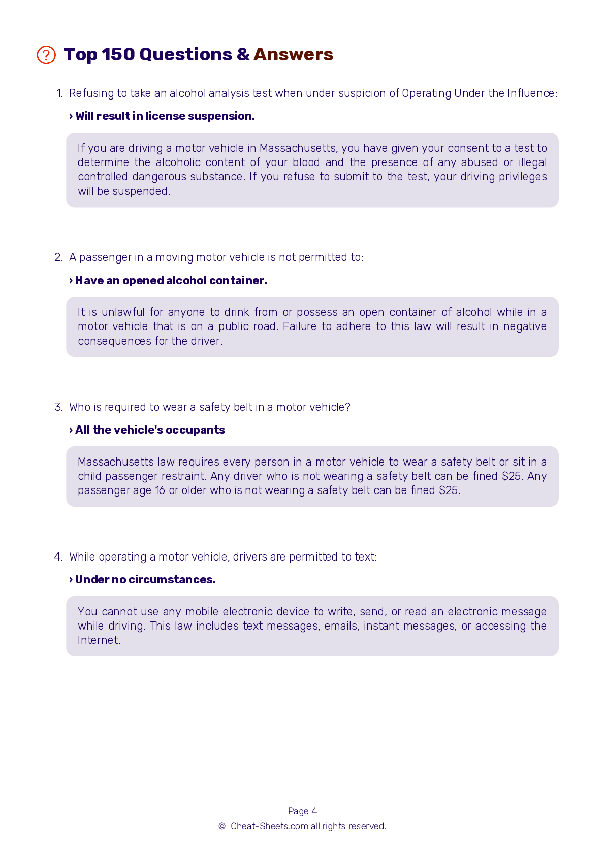 2025 Massachusetts DMV Permit Test Cheat Sheet 99 Pass Rate